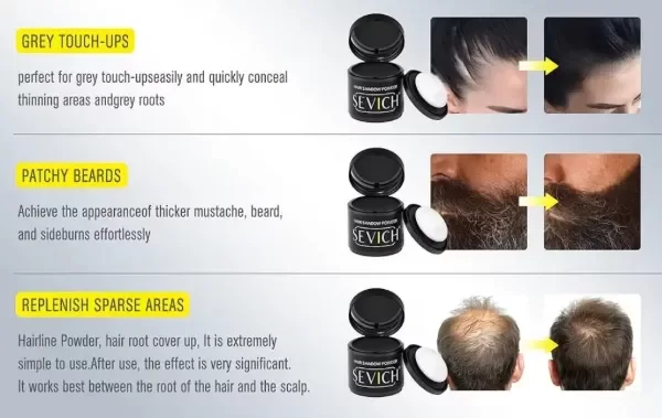 Modo de Uso: Utilizando la esponja incluída, aplicar la Sombra Capilar Sevich sobre el cuero cabelludo seco. Cubrir las zonas de menor densidad capilar hasta lograr el resultado deseado. Remover con lavado.